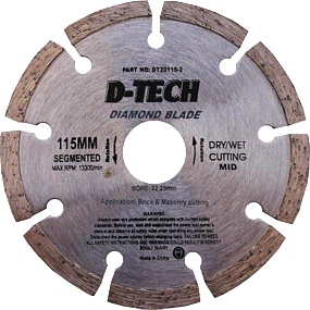 The segmented diamond blade is also known as a dry cut blade and is mostly used on dry cutting applications. Air flow cools the blade by making use of segments and cut-outs (gullets) in the body of the blade to dissipate heat.