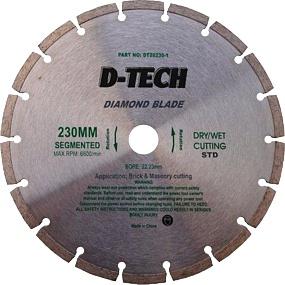 The segmented diamond blade is also known as a dry cut blade and is mostly used on dry cutting applications. Air flow cools the blade by making use of segments and cut-outs (gullets) in the body of the blade to dissipate heat.