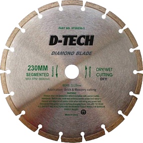 The segmented diamond blade is also known as a dry cut blade and is mostly used on dry cutting applications. Air flow cools the blade by making use of segments and cut-outs (gullets) in the body of the blade to dissipate heat.